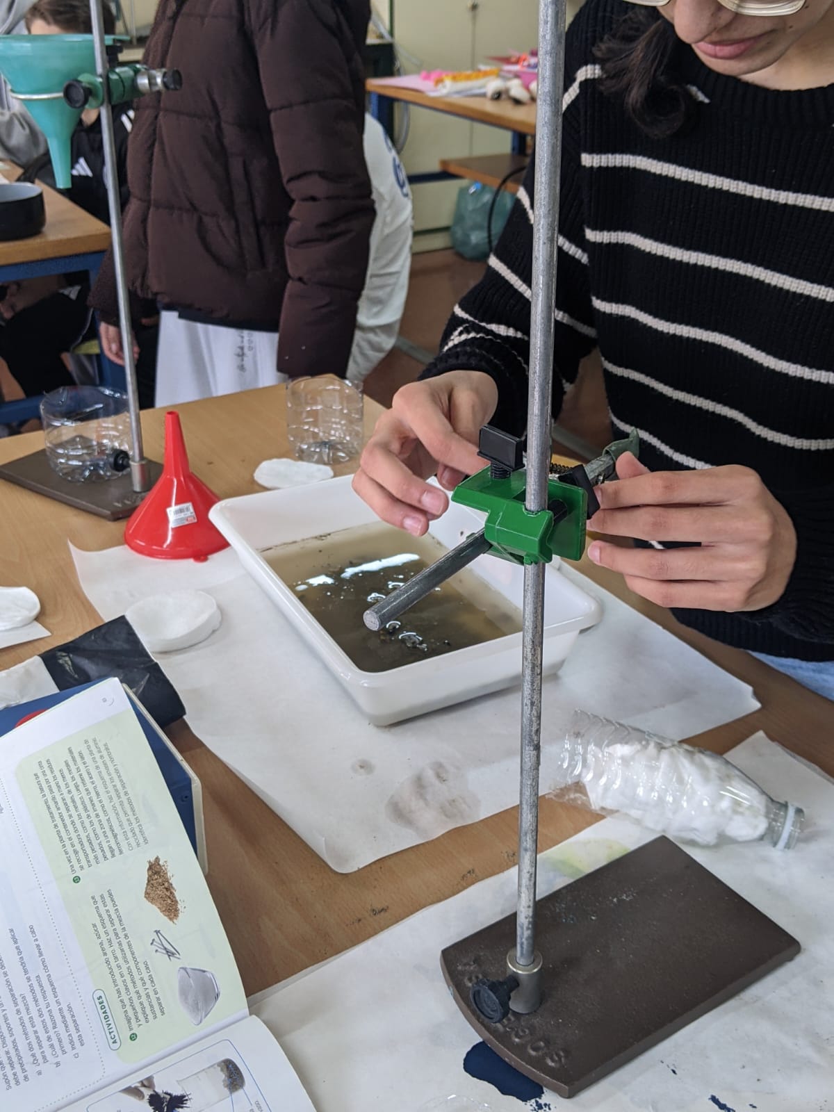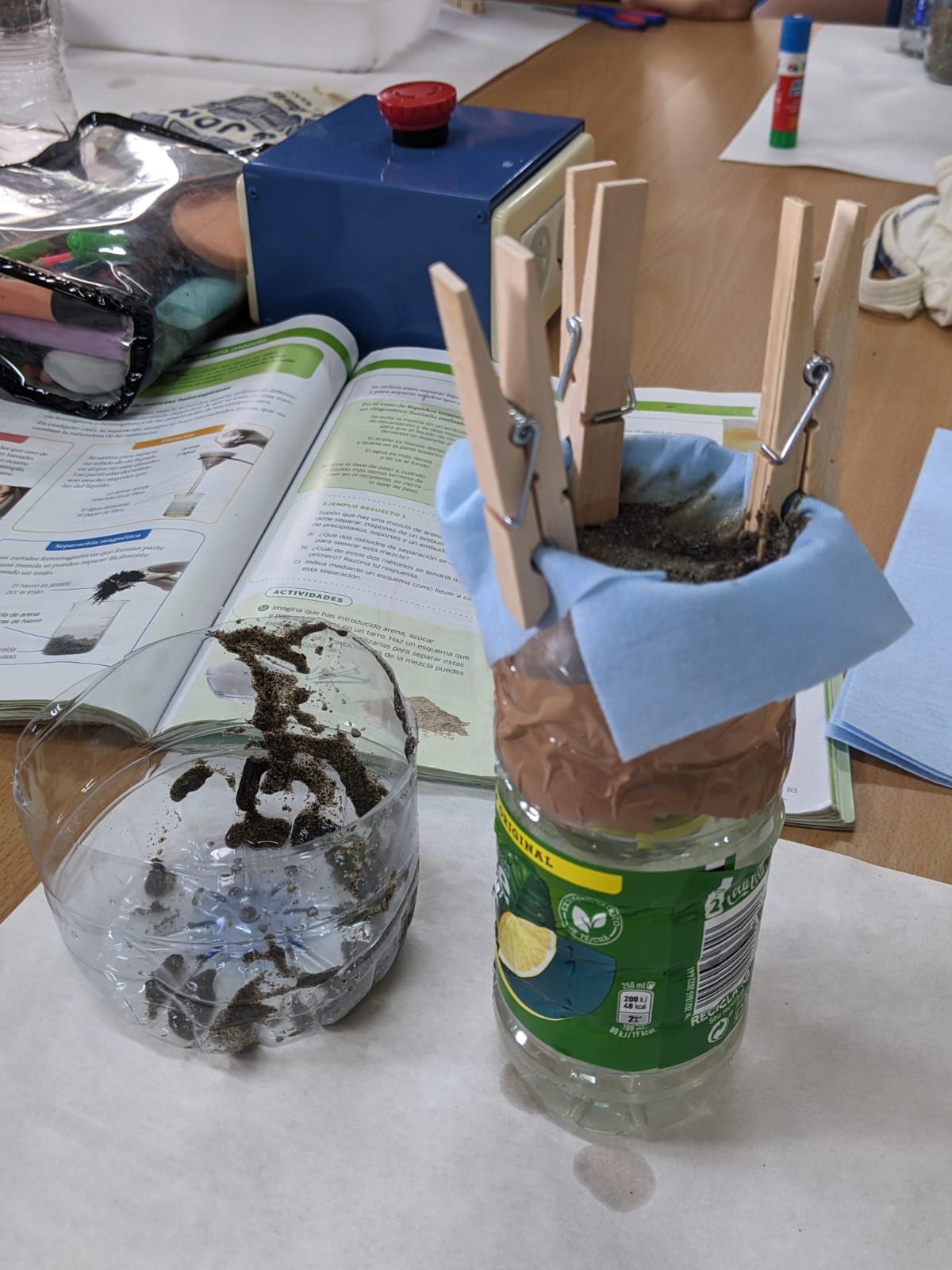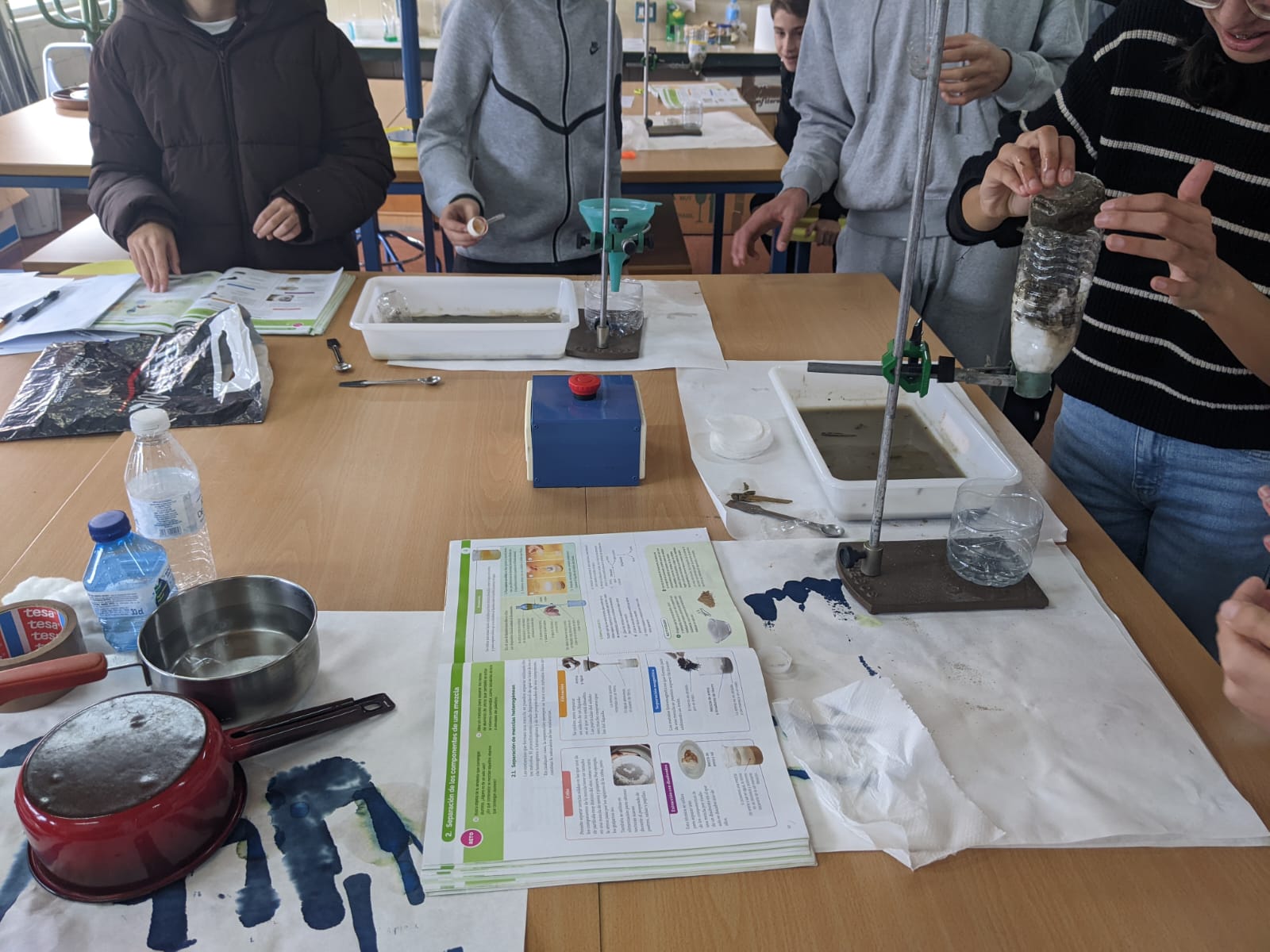 Los estudiantes, trabajando por parejas y cooperando con el resto del grupo, han aceptado el reto de purificar agua aplicando sus conocimientos sobre métodos de separación y construyendo sus propios embudos de decantación, tamices y filtros.