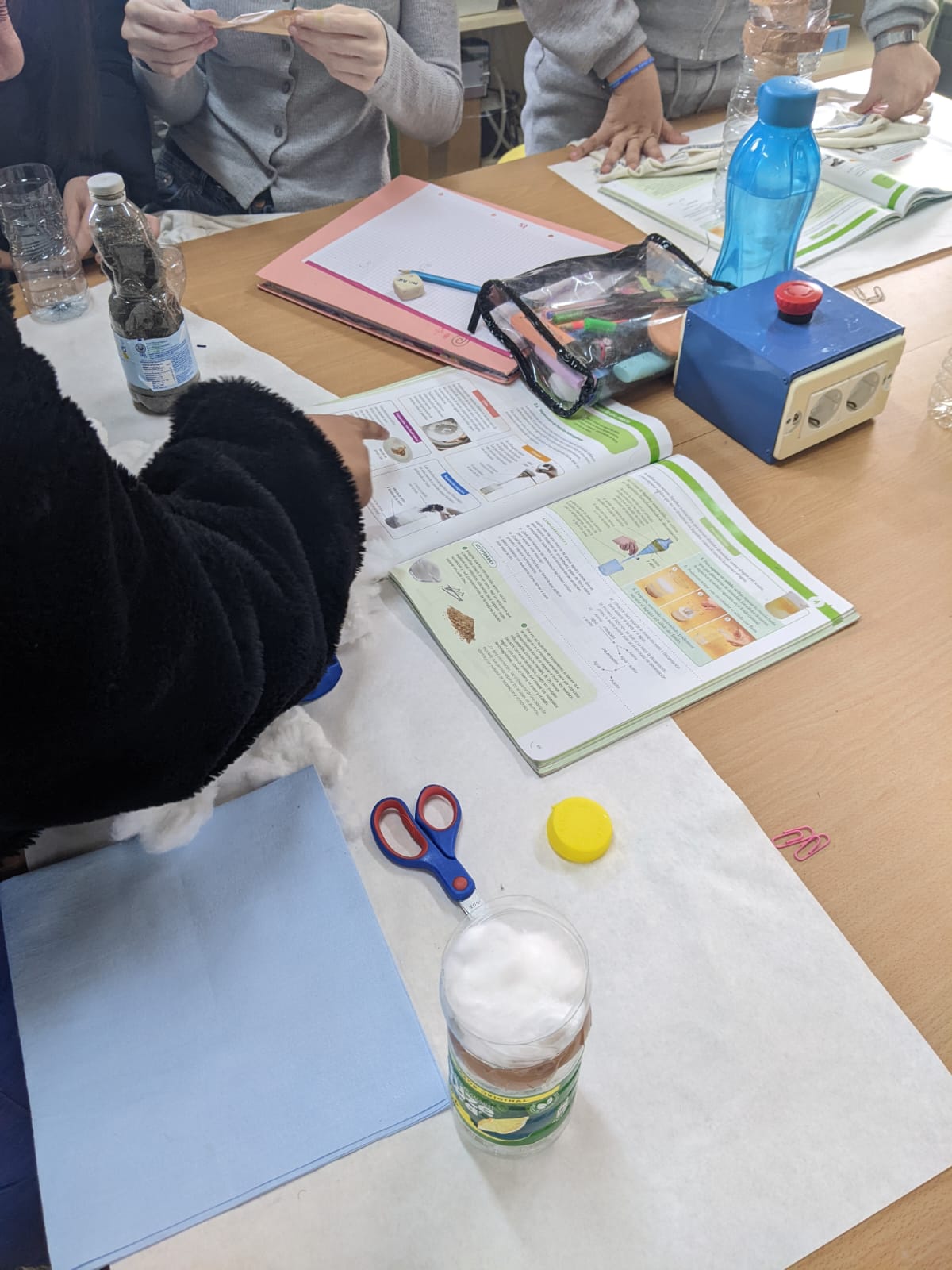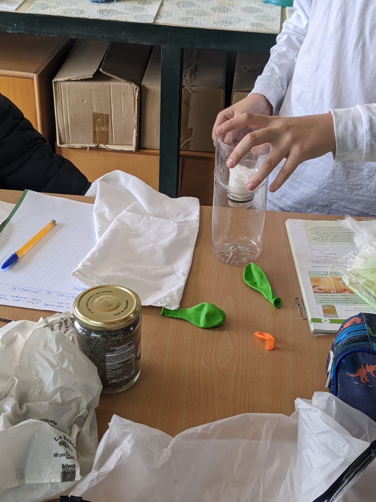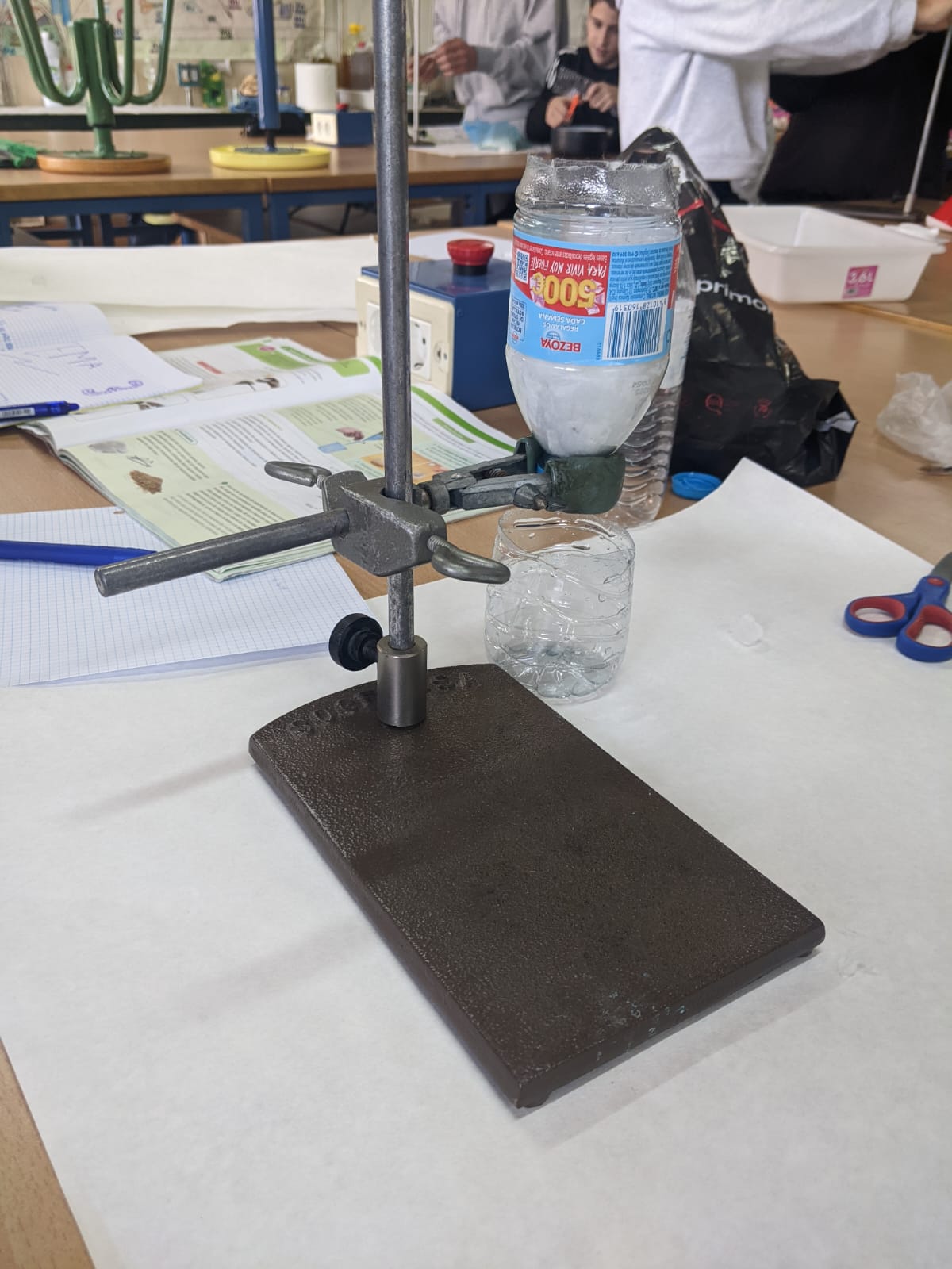 Los estudiantes, trabajando por parejas y cooperando con el resto del grupo, han aceptado el reto de purificar agua aplicando sus conocimientos sobre métodos de separación y construyendo sus propios embudos de decantación, tamices y filtros.